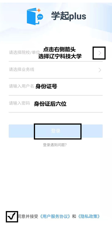 2、進(jìn)入app后,選擇遼寧科技大學(xué),輸入用戶名、密碼,并同意政策
