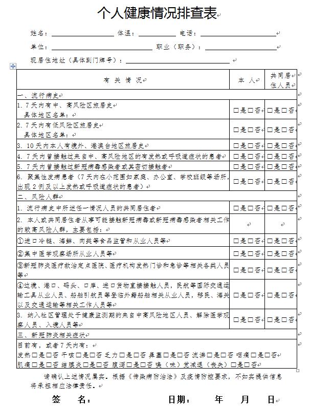 考前7天起至考前1天,考生須做好每日體溫測量,盡量避免去中、高風(fēng)險地區(qū)和人流密集的公共場所,并按要求如實填寫《個人健康情況排查表》(見附件)。